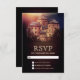 Elegante tarjeta RSVP con un hermoso castillo sobre un fondo rústico de madera de grano.