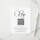 Esta moderna tarjeta de respuesta boda incluye un lugar para su código QR, de manera que los huéspedes puedan desplazarse fácilmente por su sitio web boda. La parte delantera presenta un diseño blanco y negro sencillo y limpio con tipografía de escritura con letras a la moda. El dorso mínimo es blanco sólido.