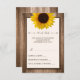 Estas tarjetas RSVP son perfectas para cualquier pareja que planee un matrimonio rústico. El diseño presenta un bonito y luminoso girasol con un ambiente rústico de madera marrón. El diseño sencillo puede ser personalizado para adaptarse a su evento especial y será la tarjeta de respuesta perfecta para cualquier fiesta con temas de moda de país, incluyendo duchas de novias, compromisos, duchas de bodas, fiestas de cumpleaños y mucho, mucho más.