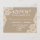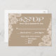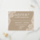 NOTA: Desplácese hasta la parte inferior de la página para ver los productos correspondientes a esta tarjeta RSVP. Esta encantadora postal de respuesta de RSVP floral de encaje es perfecta para un boda/fiesta de estilo rústico o rural o para un evento. ¡Nada dice romance como encaje! Esta encantadora tarjeta RSVP con encaje floral blanco, que bordea la información de su boda/fiesta impresa como complemento de los tipos de letra románticos cursiva y negrita en blanco, resaltados en un fondo cremoso marrón. La parte posterior de la tarjeta de respuesta muestra la dirección en la que los huéspedes deben devolver sus tarjetas. Puede personalizar completa de esta invitación: puede cambiar los colores de fondo, los estilos de fuente y los colores. También puede eliminar fácilmente la opción de menú para adaptarla a sus necesidades. Las postales RSVP son la alternativa económica a las tarjetas de respuesta regulares ya que requieren menos franqueo y sin sobres extra. Las postales RSVP pueden ser personalizadas y usadas para... * Bodas * Fiestas - graduaciones, aniversarios, cumpleaños, etc * Ventas y eventos de negocios * Duchas de novias y bebés * Organizaciones benéficas / recaudadores DE fondos POR FAVOR NOTA: Desplácese hasta encontrar productos coincidentes - notas de agradecimiento, pegatinas, detalles y tarjetas de recepción, ducha de novias y invitaciones para la cena, guardar las fechas, y más. Etiquetas: Rsvp marrón, Rsvp bronceado, boda marrón y blanco, tarjeta Rsvp marrón y blanca,