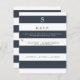 PALETA DE COLORES: azul marino y blanco COLECCIÓN DE DISEÑO: Tarjetas de respuesta RSVP de diseño vertical coincidente con opciones de menú (simplemente elimine o reemplace el texto en esa línea si no las necesita). Con un tema de diseño elegante y moderno de franjas anchas, esta invitación tiene un estilo contemporáneo de moda. Cada capa de texto alterna con el azul oscuro y el blanco para un efecto simple pero impresionante. Gráfico audaz, pero elegante y con estilo. Tenemos un conjunto de productos completo para coordinar. La inicial monograma y la información de RSVP son fáciles de personalizar con los campos de plantilla de personalización.