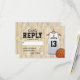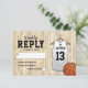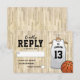 Tarjetas de respuesta para fiesta de bar mitzvah con fondo de cancha de baloncesto, camiseta blanca con el nombre de su hijo, número, estrella de David, y una plantilla de RSVP fácil de personalizar.