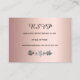 Sencillo y elegante, con plantas suculentas, cactus y flores, sobre un fondo de diseño de color rosa de imitación metálica. Flores de plata, verde y rosa claro. Tarjeta RSVP con plantillas para responder por correo o teléfono. Atrás: nombre de la novia y del novio y fecha del boda.