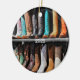 Rueda de vagón antiguo y botas de vaquero de Fort Worth Texas. Interesantes objetos del "viejo oeste" vistos en los almacenes Fort Worth.