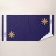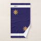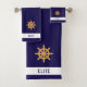 Elegante rueda náutica dorada sobre el juego de toallas de baño azul marino. El texto se puede personalizar.