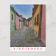 Una hermosa vista de una calle estrecha bordeada de casas coloridas en el casco antiguo de Sighisoara en Rumania impresa en una postal.