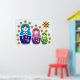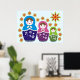 Russian Matryoshka Doll In Sunflowers Poster print featuring three colorful Russian Matryoshkas Dolls on pale cyan blue background and stylized sunflowers around them.