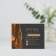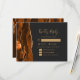 El borde izquierdo de esta elegante y moderna tarjeta de recinto RSVP para bodas cuenta con un naranja quemado y una acuarela rojiza bordeada con falso purpurina de oro. El título "Kindly Reply" aparece en un guión de escritura a mano de color dorado, con el texto restante en copperplate y tipografías cursivas en un fondo negro. Incluye espacios para que los huéspedes puedan elegir entre tres entradas editables. En el reverso se encuentra un naranja quemado a juego y un diseño de agate dorado.