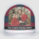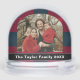 Capture your favorite holiday moment in this personalized snow globe featuring a red and black plaid base, your family name, and a cherished photo