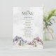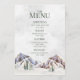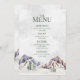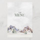 A rustic winter wedding menu with a beautiful snow covered mountain evergreen forest scene.