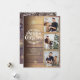 Un elegante diseño de collage de 3 fotos estilo rústico para personalizar con tus fotos favoritas en marcos dorados, mensaje, nombres y año en un fondo de madera rústica. El reverso presenta copos de nieve que caen sobre un fondo de paneles de madera rústica a juego. Diseñado por Thisisnotme©