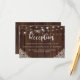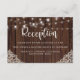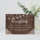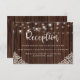 Carta de detalles de recepción de bodas de encaje rústico de madera y de hilo de cuerda con un fondo rústico de madera con cuerdas de luces brillantes y encaje de estilo vintage en las esquinas inferiores. La palabra "recepción" se utiliza en una tipografía elegante y rústica, por lo que es el diseño perfecto para una boda de boho o de campo. Póngase en contacto con nosotros en cedarandstring@gmail.com si necesita ayuda con el diseño o productos de coincidencia.