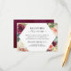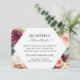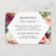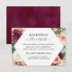 Las tarjetas de recepción floridas "vamos a celebrar", bodas florales, cuentan con un marco hexagonal geométrico acentuado por hermosas flores de color de agua de verano y otoño, entre ellas rosas, dahlias, flores de peonía y vegetación, en una espléndida paleta de otoño de rojo burdeos, amarillo dorado, naranja de melocotón, rosa rubor y tonos verdes. Un fondo rojo burdeos con apariencia texturizada se viste por la parte posterior de la tarjeta.