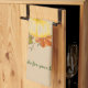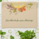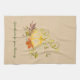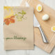 Hermosa toalla de cocina de otoño con paleta de colores naranja, amarillo, dorado y verde. Calabaza y vegetación decoran el conjunto. En letra de guión: Agradece sus bendiciones.