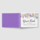 Rosas morados y rosas blancas de marfil se combinan con muchas hojas y ángulos para crear un hermoso borde floral a lo largo de la parte superior de este libro de bodas. El libro de invitados está escrito en un gran guión. Los nombres de la pareja de bodas, la ubicación del boda y la fecha siguen en un tipo de letra serif clásico
