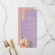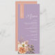 El ambiente romántico de la recepción nupcial se refleja en este rústico menú boda floral con nombres personalizados. Diseñado con un suave fondo violeta, un elegante encabezado de guión y una tira de nombres de melocotón vertical única, este menú añade un toque moderno y acogedor a la configuración de la mesa. Las flores de color rosa, melocotón, marfil y lavanda de fondo evocan el encanto de finales de verano o principios de otoño, perfecto para modas rústicas, boho garden o bodas del campo. El texto totalmente editable le permite personalizar con facilidad de cada curso y nombre de invitado.