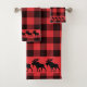 Una rústica toalla de mango de búfalo de alce con estampado rojo y negro y siluetas de alce. Perfecto para la decoración del cuarto de baño o la decoración rústica de la cabaña.