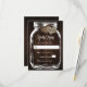 Tarjetas RSVP de boda rústicas personalizadas de madera de campo y carros de masón con un frasco de albañil con dos corazones de bupón sobre un fondo rústico de madera. Personaliza fácilmente en línea. Artículos de juego disponibles para complementar estas adorables tarjetas RSVP de bodas rústicas con jarros de albañil.