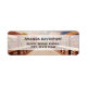 Etiquetas de direcciones con una fotografía panorámica. Un puente de madera que conduce a un camino rodeado de árboles que cambian de color.