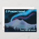 Luces nórdicas moradas y azules brillan sobre montañas cubiertas de nieve en una noche fría en Alaska. El texto en cirílico (ruso) que dice "S Rozhdestvom" (С Р о ж д с sniht - Un saludo de Navidades rusos) aparece en azul y blanco resplandeciente. Añade tu propio texto adicional.