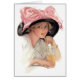 Mujer joven tomando un refresco mientras usa un gorra negro con un gran arco rosado. Una deliciosa escena vintage.
