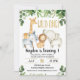 Animales salvajes de safari o selva, invitaciones de un cumpleaños con cuatro acuarelas, textos falsos de oro y algunos follaje o vegetación. Esta invitación es una manera agradable de invitar a los invitados de su pequeña a su fiesta de primer cumpleaños.