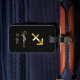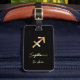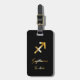 Elegante etiqueta de equipaje con signo sagitario dorado sobre fondo negro.