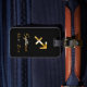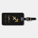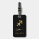 Elegante etiqueta de equipaje con signo sagitario dorado sobre fondo negro.