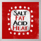 "Calor de sal de grasa de ácido" es un divertido diseño de texto con una forma de acento blanco rodeado de puntos blancos y brillantes en textura.