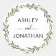 Guión de caligrafía encantadora gracias boda, pegatinas matrimoniales/sellos para añadir a sus sobres, invitaciones, tarjetas y/o favores de regalo. Verde, vegetación, corona, laurel sobre fondo blanco. Perfecto para cualquier boda temático de primavera, primavera o verano. Etiquetas de plantilla modificables.
