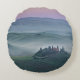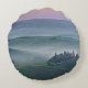 Almohada de tiro redonda con una salida del sol de niebla con un cielo y una niebla rosados entre las colinas toscanas sobre el cortijo del belvedere de IL del podere del agriturismo en el Valdorcia (valle de Orcia) entre Pienza y San Quirico en Toscana, Italia.