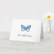 Ponte bien pronto con una carta de saludo con mariposa azul y púrpura sobre ella.