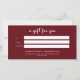 Salón, Árbol de Navidad Rojo-Oro - Letra de guión, Elegante, Festividad, Certificado de regalo de negocios "Un regalo para ti" Tarjeta. Este certificado de regalo, muy bien diseñado, es perfecto para las vacaciones. Con un diseño de árbol elegante y festivo adornado con acentos dorados, este certificado aporta elegancia y alegría navideña a cualquier regalo. Ideal para empresas que buscan ofrecer una opción de regalo pensante y profesional, este certificado es versátil y puede ser personalizado para una variedad de ocasiones, ya sea para clientes, empleados o seres queridos. Celebra la temporada con un regalo que deja una impresión duradera. Este certificado de regalo festivo ofrece elegancia y flexibilidad, por lo que es una forma memorable de compartir la alegría y la apreciación de las vacaciones. Perfecto para spas, centros de bienestar y otros servicios profesionales.