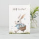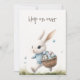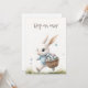 Invite a sus invitados a una caprichosa celebración de primavera con esta invitación de Pascua doble "Hop on over". La parte delantera presenta una suave ilustración de acuarela de un conejo blanco con un suéter a cuadros azules, que lleva alegremente una cesta de huevos moteados. La parte posterior está dedicada a los detalles de su fiesta, ofreciendo un diseño claro y organizado para la información de su brunch o búsqueda de huevos. Es una opción encantadora y de alta calidad para una reunión festiva familiar.