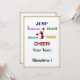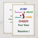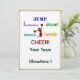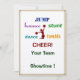 Esta tarjeta de la invitación ofrece una silueta de una animadora en el medio de un collage rodeado salto de las palabras salta, despide, baila, impide, cae y alegría en azul, verde, rojo y amarillo/naranja. Hay también un placeholder para su texto - su nombre, su equipo de la animadora o un mensaje promocional.