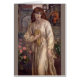 Saludo a Beatrice por Dante Gabriel Rossetti, aceite sobre lienzo 1880-1882, pintura pre-Raphaelite de una figura femenina con una larga bata blanca parada en medio de panecillos de flores contra un fondo gótico gris y medieval de fondo de castillo.