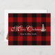Saludo de Feliz Navidad en cuadros rojos y negros de búfalo con árbol de vacaciones blanco y campanas