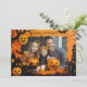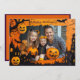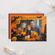 Esta tarjeta de felicitación de Halloween presenta una escena de pueblo de estilo caricaturesco juguetón al atardecer. El espacio de foto rectangular está rodeado de edificios de dibujos animados caprichosos y coloridos, cada uno con características exageradas y decoraciones alegres de Halloween. El sol poniente proyecta un cálido resplandor naranja sobre el pueblo, creando un fondo vibrante y festivo.