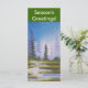 Este marcador tiene una imagen basada en una pintura original de tela del artista Artcor7. Muestra un valle de río con un bosque de pinos y la expresión: "¡Saludos de temporada!" En la parte de atrás, tiene una expresión inspiradora del mismo artista así como "¡Feliz Año Nuevo!" con un fondo verde.