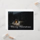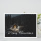 La carta muestra una escena evocadora y empinada con una pequeña cabaña de madera iluminada en medio de un bosque cubierto de nieve. La fuente de luz del interior crea un bonito contraste con el entorno oscuro y tranquilo. La elegante inscripción "Feliz Navidad" en blanco le da al motivo un toque festivo. 🎄 ✨