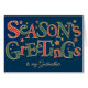 Una tarjeta de Navidades de diseño para una Madrina, con "Season's Greetings" (Saludos de temporada) con letras de puntos de polka rojo y blanco y verde oscuro y blanco, delineado con un efecto dorado sobre un fondo azul profundo y repartido con estrellas de efecto dorado y rojas. Puede cambiar fácilmente el mensaje interno en este diseño digital basado en texto de Judy Adamson y si no encuentra una tarjeta para la persona a la que desea enviarla, hay una versión personalizado que puede personalizar.