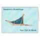 Un perro enrollado con una bolsa de trineo verde azulada superpuesta sobre una imagen de fondo nevada. También aparece un texto que dice "Saludos de temporada". Añade tu propio texto adicional en la parte inferior derecha y en el bolso.