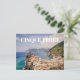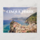 Comparte la belleza y el encanto de Vernazza, una de las cinco coloridas ciudades de Cinque Terre, con esta impresionante postal. La fotografía capta un día despejado con aguas azul brillante y una colina verde y exuberante, complementada por los distintivos edificios rosas que le dan un toque de color. La parte delantera de la postal dice "Saludos desde Cinque Terre", mientras que la parte trasera queda en blanco para su mensaje personal. Esta postal es la manera perfecta de compartir su amor por Italia y la belleza de sus pueblos costeros.