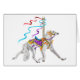 Este elegante sabueso está en movimiento, con un traje árabe tradicional con borlas y bordas - él (o ella) está de pie con un poste de carrusel adornado con una cinta. ¡El arte de los perros Saluki blancos es genial para cualquier época del año para alegrar algún día!