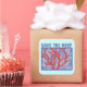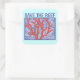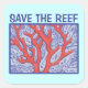Diseño azul vivo y naranja a partir de un original dibujo de marcadores prismacolor de Angela Hoard-Dunn. Estos pegatinas muestran una alegre escena de arrecifes colorida y caprichosa. Muchos peces azules felices rodean un coral naranja brillante y el mensaje es "Salven el arrecife".