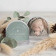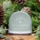 Un hermoso diseño clásico de globo de nieve para conmemorar la primera Navidad del bebé. Personalice el frente con el nombre del bebé en letras clásicas del serif, junto con el año, sobre un suave eucalipto de fondo verde con un solo acento de copo de nieve, y añada una foto al fondo.