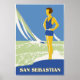 Pequeño poster de tamaño estándar. Dibujo vectorial antialidado propio inspirado en un anuncio de viaje de los años 20 para San Sebastián, España. Donostia-San Sebastián es una ciudad y municipio ubicado al norte de España, en la costa del Golfo de Vizcaya y a 20 km de la frontera francesa. La ciudad es la capital de Gipuzkoa, en la comunidad autónoma del País Vasco.