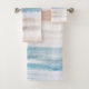 Toalla de baño Set de 3 accesorios de decoración de baño impresos con el ilustracion de diseño de arte Sandy Beach Ocean Abstract Watercolour de The FabricSeal print on demand shop en Zazzle.com #ZazzleMade https://www.zazzle.com/store/thefabricseal. Esta pintura abstracta color agua salada diseña la playa de arena costera, el bronceado de verano, el océano azul que estremece las olas y el cielo azul turquesa en el horizonte, con colores arena de paleta, bronceado, beige, azul marino, azul cielo, morado, turquesa, marrón, blanco, gris y gris. La tienda también cuenta con varios cuadros lineales abstractos similares con otros colores, como suaves, brillantes, audaces, pastel, rosa, violeta, verde, naranja, amarillo, marrón, tostado, rojo, turquesa y azul. Míralos. Ideal para mezclar y hacer coincidir las opciones de productos. Todos los más de 500 diseños de nuestra tienda están disponibles para procesos de personalización con productos de Zazzle.