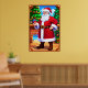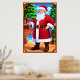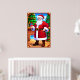 Este ilustracion personalizado muestra a Santa Claus parado frente a árboles y regalos de Navidad. Lleva puesto su traje rojo tradicional y su gorra, y tiene una larga barba blanca. El árbol de Navidad está decorado con luces y adornos. Otro nombre para Santa Claus, san Nicolás, Kris Kringle, Padre Navidad, San Nicolás. Este es un arte generado por IA.