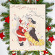 Tarjeta de vacaciones de Santa de Navidad vintage bailando con niña.